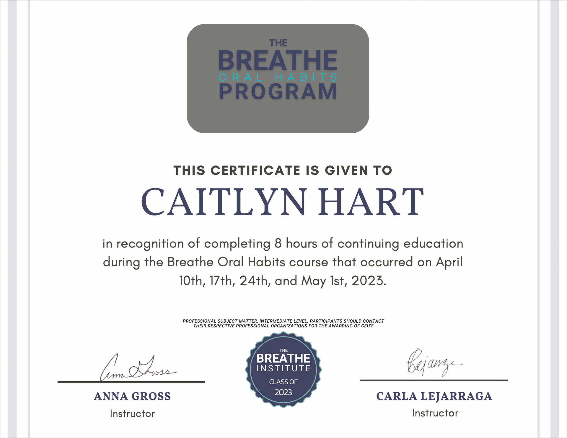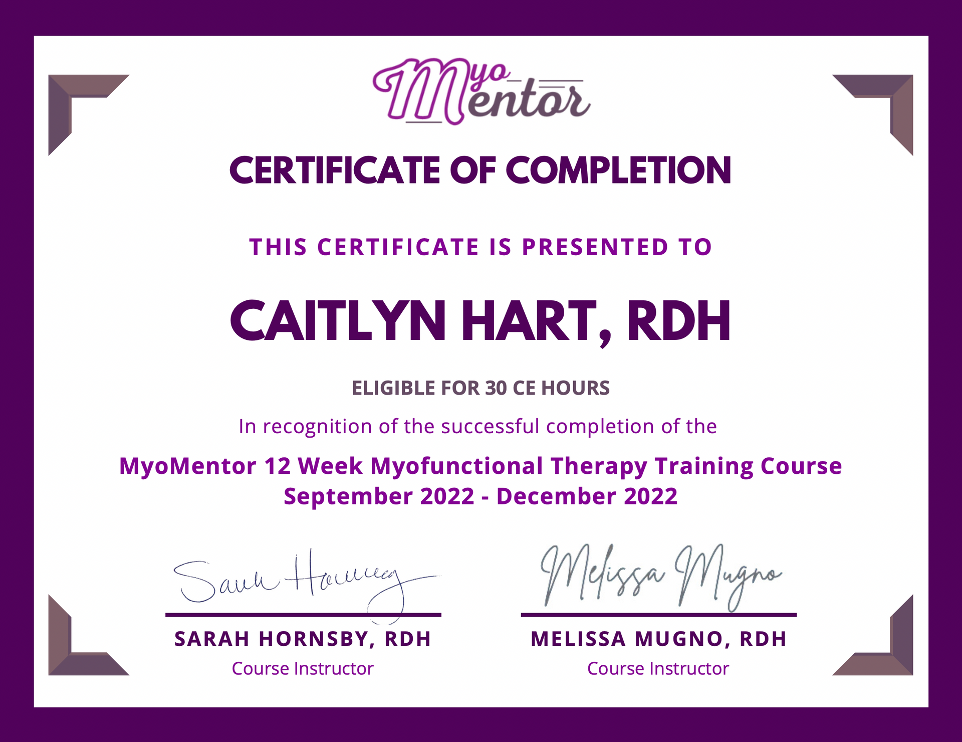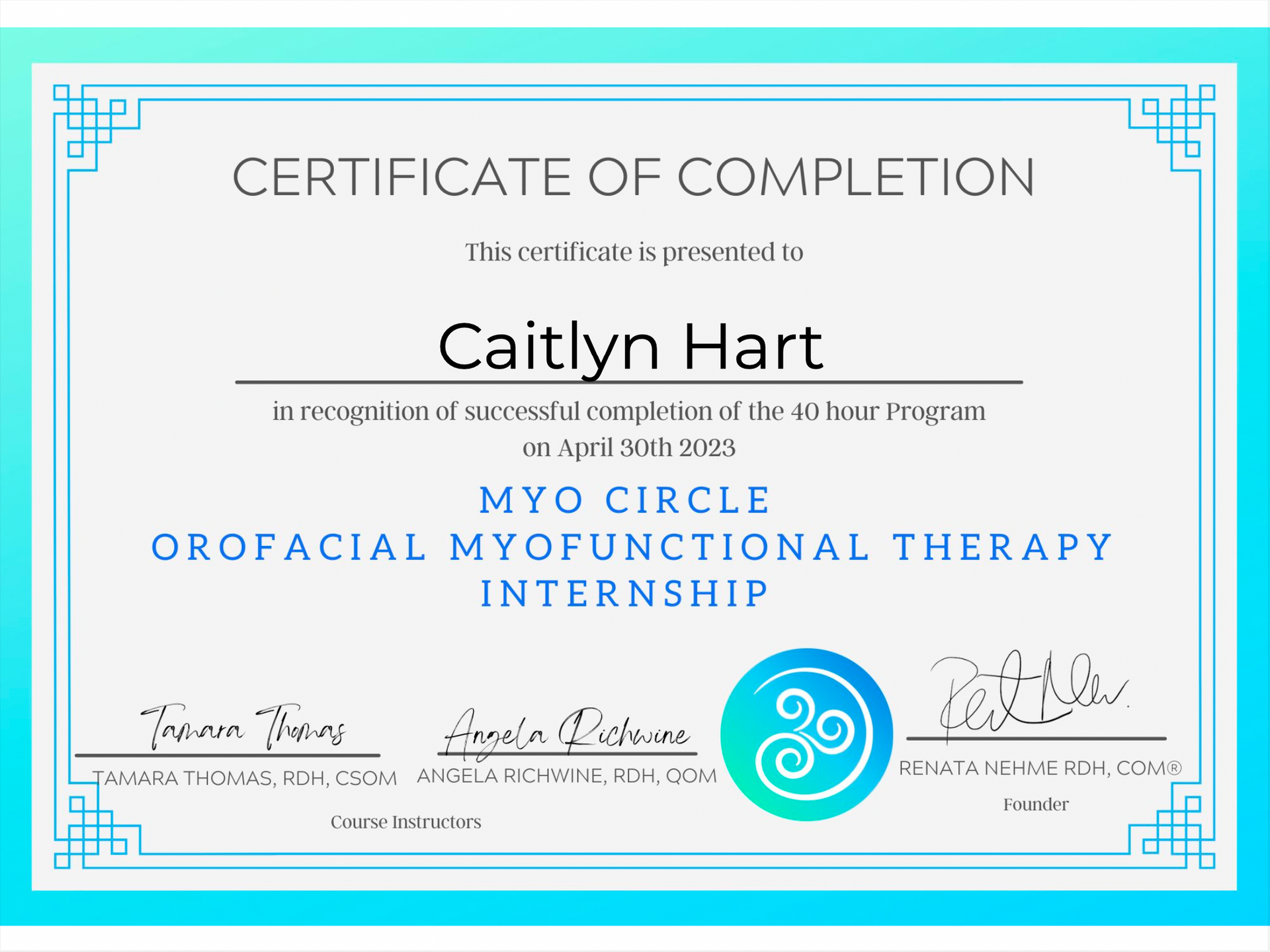 Caitlyn's myofunctional therapy training began with Sarah Hornsby's MyoMentor course in 2019. She was fortunate to be able to retake the course in 2021 and 2022 as the research and protocols are constantly evolving. In 2023, she completed MyoCircle 2.0 and Breathe Oral Habits courses to further advance her knowledge in the field to better serve patients.